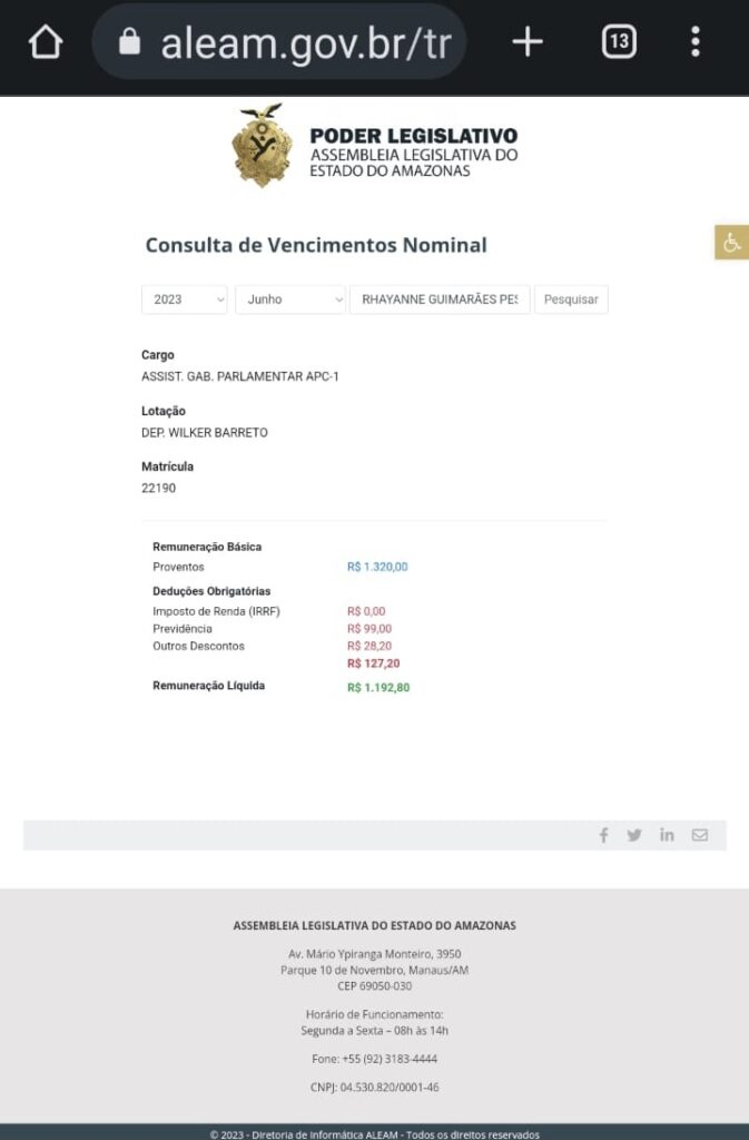 O nome de Rhayanne Guimarães Pessoa consta na folha de pagamento do Poder Legislativo da Aleam, lotada especificamente no gabinete do deputado Wilker Barreto. A servidora de Tonantins, recebeu o salário como assistente parlamentar de janeiro até junho.