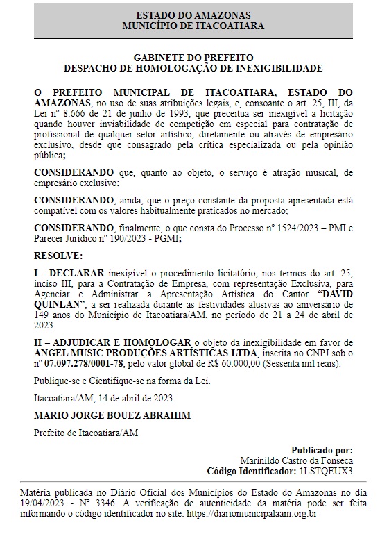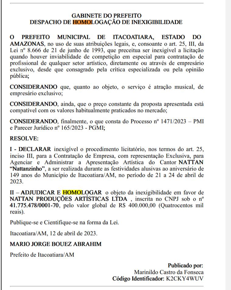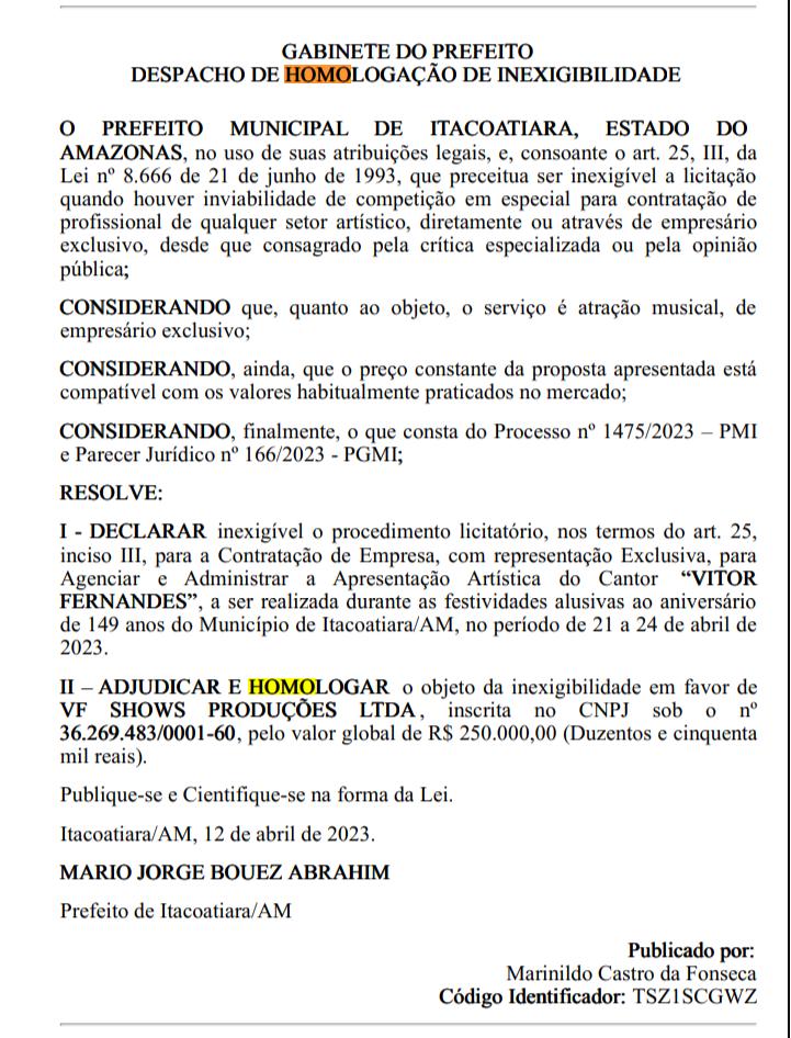 “O prefeito municipal de Itacoatiara, Estado do Amazonas, no uso de suas atribuições legais, e, consoante o art. 25, III, da Lei nº 8.666 de 21 de junho de 1993, que preceitua ser inexigível a licitação quando houver inviabilidade de competição em especial para contratação de profissional de qualquer setor artístico, diretamente ou através de empresário exclusivo, desde que consagrado pela crítica especializada ou pela opinião pública”, justifica a prefeitura, no documento.