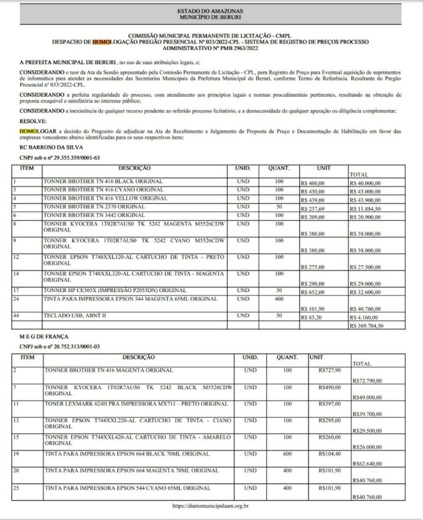 O documento tem como objetivo o Registro de Preço para eventual aquisição de suprimentos de informática para atender as necessidades das Secretarias Municipais da Prefeitura de Beruri.