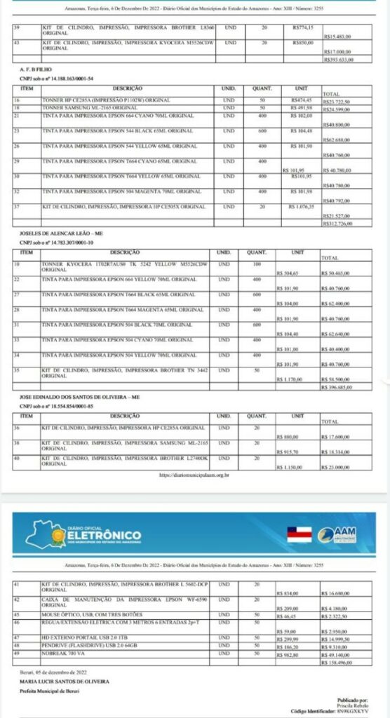 Amazonas – A prefeita de Beruri, Maria Lucir de Oliveira, a dona Maria (MDB) vai gastar mais de R$ 1 milhão de reais com tintas e tonners. A informação foi publicada nesta terça-feira (6) no Diário Oficial dos Municípios.