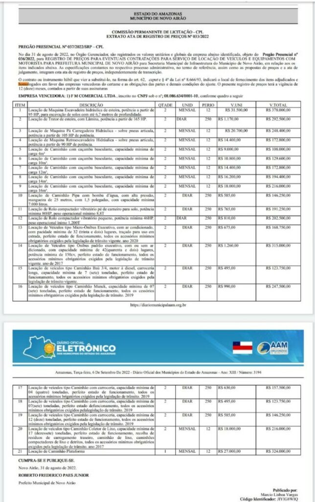 No documento, a para o prefeito fechar o contrato, foi levado em consideração a realização do Pregão presencial que visava o “registro de preços para eventuais contratações para serviço de locação de veículos e equipamentos com motorista para a Prefeitura Municipal de Novo Airão”.