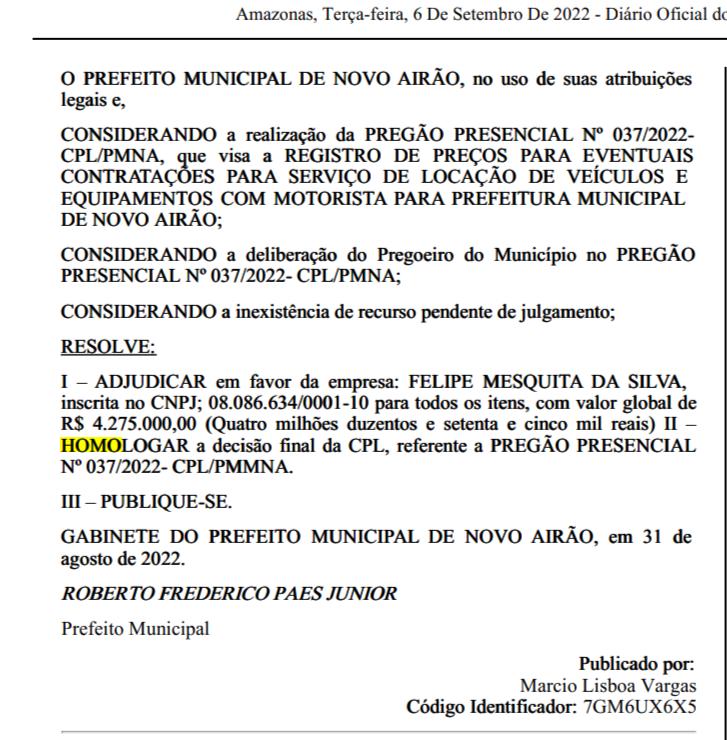 Amazonas – O prefeito de Novo Airão, Roberto Frederico Paes Júnior, o Frederico Júnior (PSC), vai gastar mais R$ 4,2 milhões para contratar serviço de locação de veículos para o município. O despacho de adjudicação e homologação do Pregão Presencial nº 037/2022 foi publicado no Diário Oficial dos Municípios do Amazonas.