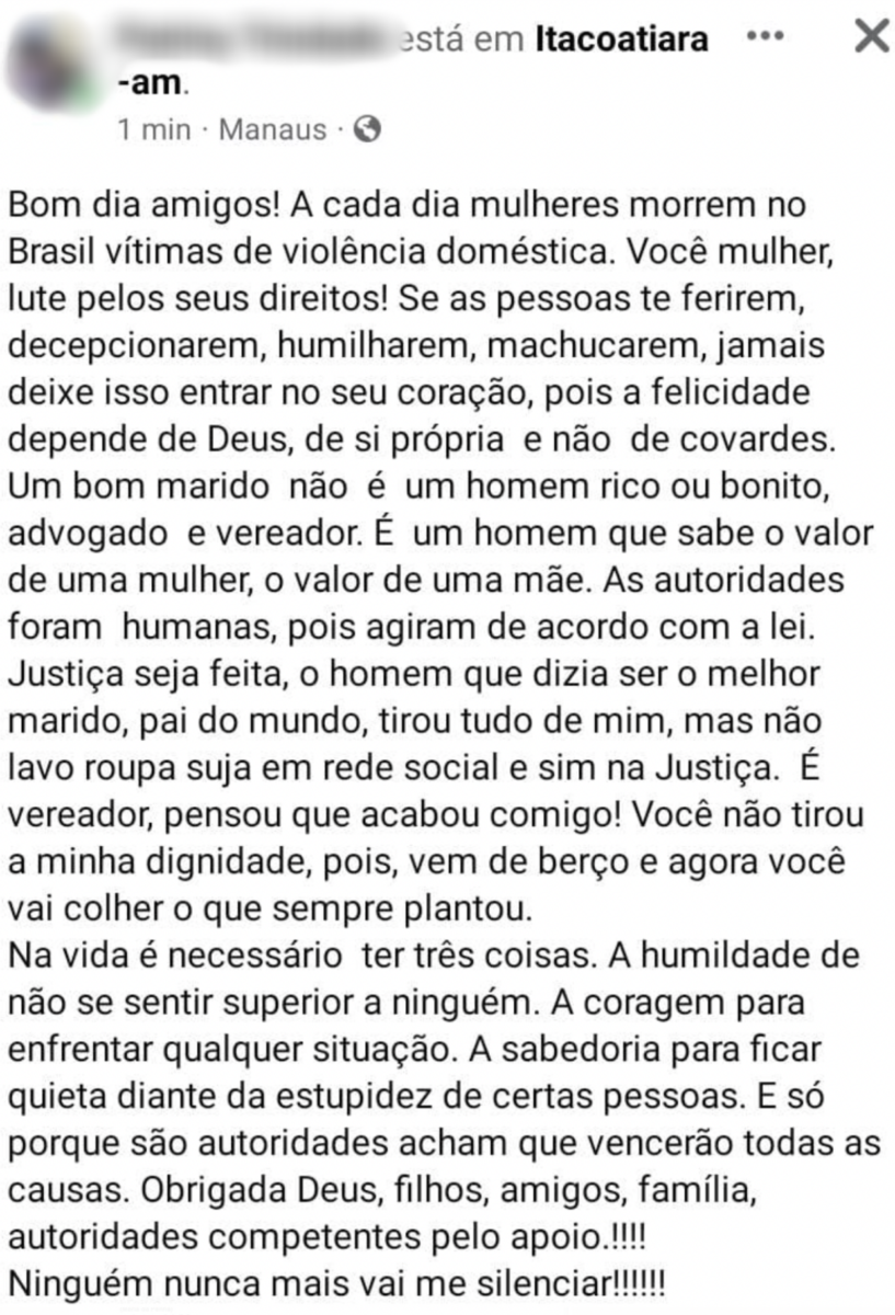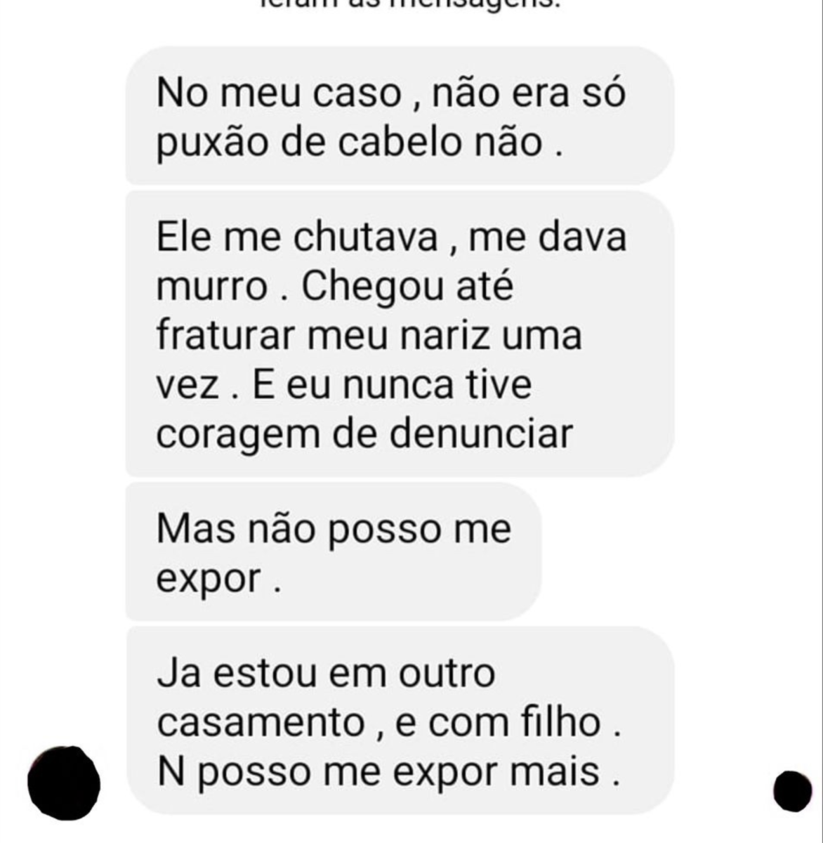 Nas mensagens e em uma publicação no Facebook, a ex-companheira relata de maneira detalhada as supostas agressões sofridas ao longo de cinco anos de relacionamento.