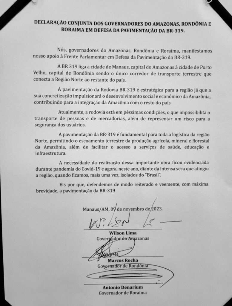 A recuperação da BR-319 também ganhou destaque, com a assinatura de um manifesto de apoio durante o fórum. Os governadores do Amazonas, Roraima e Rondônia endossaram o documento organizado pela Associação PanAmazônia, reforçando o compromisso com a revitalização da rodovia que conecta Manaus a Porto Velho.