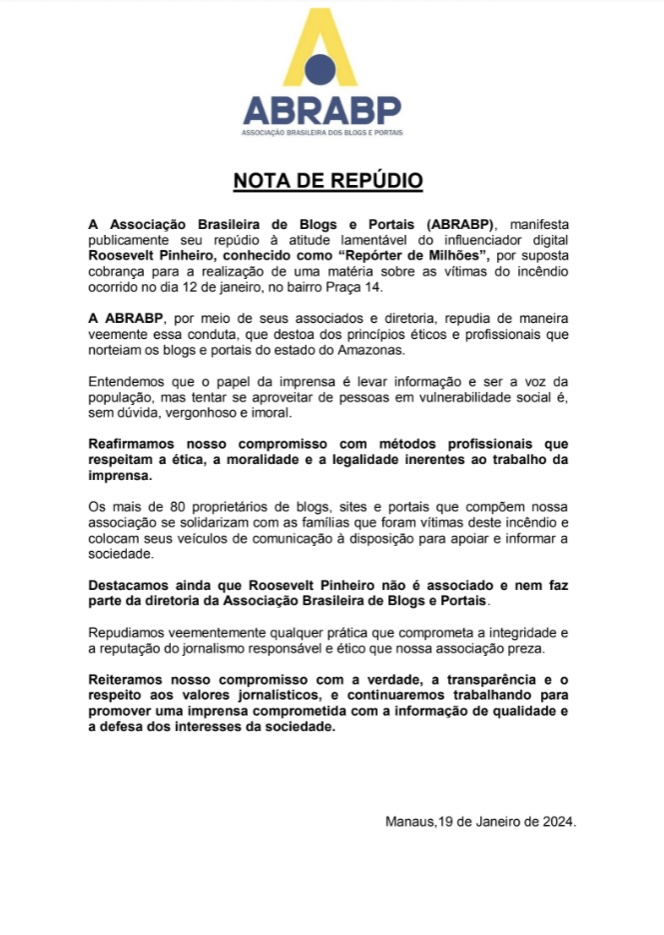 Amazonas – A Associação Brasileira de Blogs e Portais (ABRABP) repudiou veemente nesta sexta-feira (19) à atitude condenável do influenciador digital Roosevelt Pinheiro, conhecido como “Repórter de Milhões”. A denúncia de suposta cobrança para realizar uma matéria sobre as vítimas do incêndio ocorrido no bairro Praça 14, em 12 de janeiro, chocou a comunidade jornalística e vai de encontro aos princípios éticos e profissionais dos blogs e portais do estado do Amazonas.