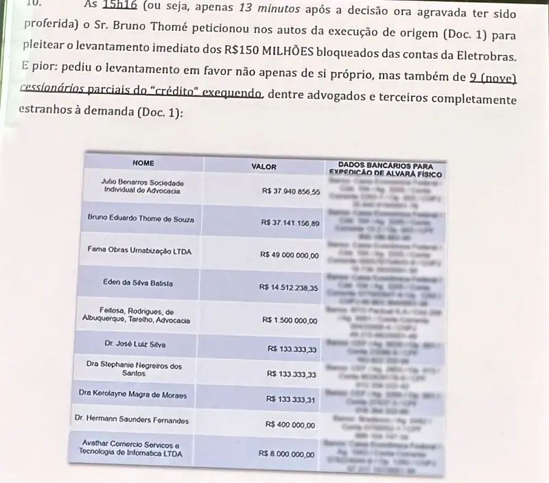 Com a decisão favorável a Bruno Thomé, o pagamento de R$ 150 milhões foi realizado. No entanto, surgiram suspeitas sobre a distribuição desse valor entre várias entidades e pessoas, incluindo advogados, peritos e empresas aparentemente alheias à demanda judicial.