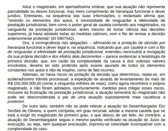 Após um processo que ocorreu de maneira acelerada, o desembargador Elci Simões inicialmente não autorizou o pagamento. Contudo, poucos dias depois, ele reverteu sua posição e determinou que o montante fosse liberado. A Corregedoria Nacional de Justiça, sob comando do ministro Mauro Campbell, apontou irregularidades no trâmite, destacando que a expedição de alvarás para levantamento do valor não foi devidamente precavida, deixando de adotar medidas necessárias para mitigar os riscos envolvidos na ação.