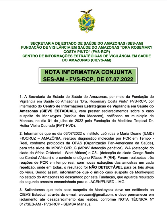 Amazonas – A Secretaria de Estado da Saúde do Amazonas (SES-AM) descartou o último caso suspeito de varíola dos macacos (Monkeypox) nesta quinta-feira (7). Com isso, o Estado zera os casos notificados da doença.
