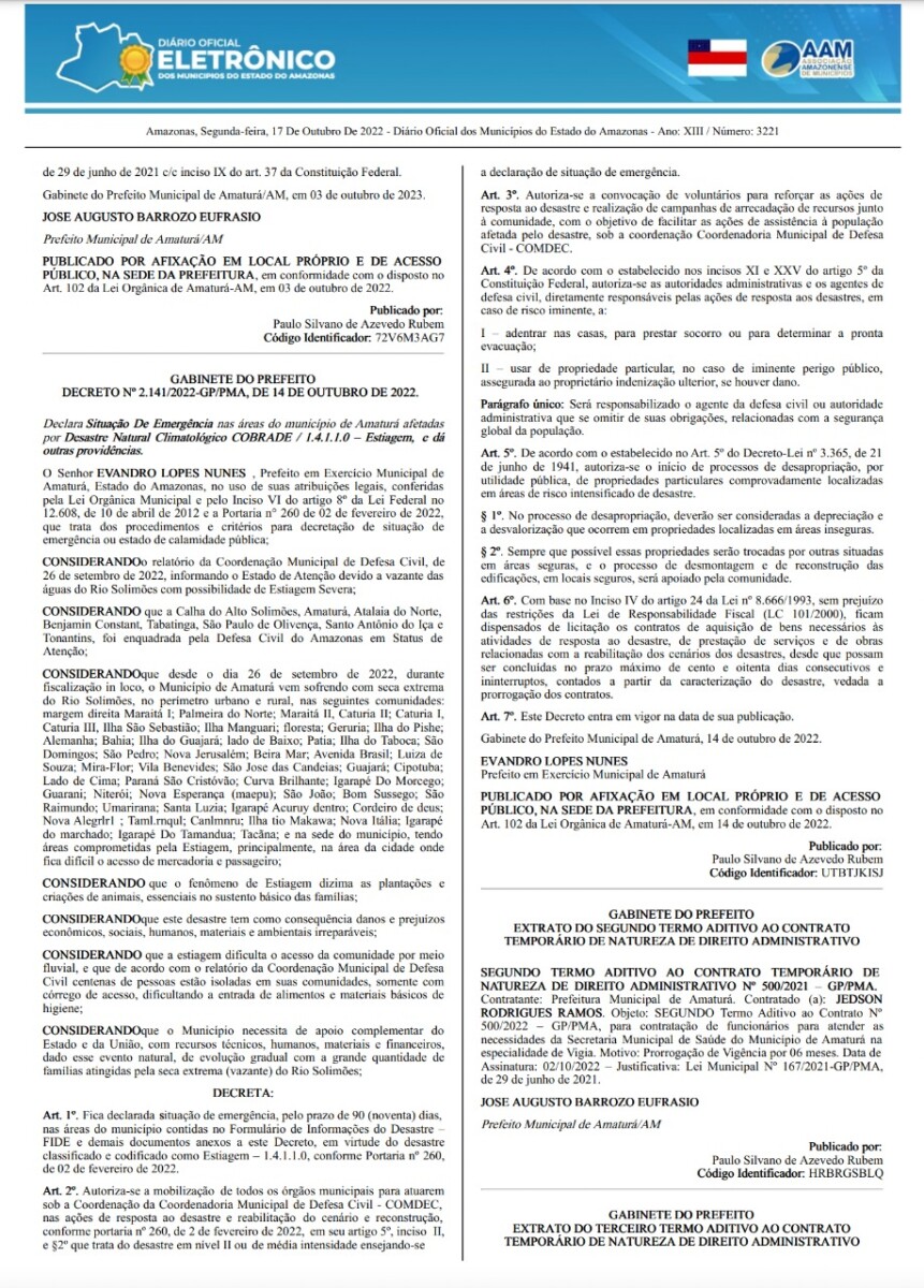 Segundo a publicação do decreto, desde o dia 26 de setembro de 2022, o Município de Amaturá vem sofrendo com seca extrema do Rio Solimões, no perímetro urbano e rural, dizimando plantações e criações de animais, essenciais no sustento básico das famílias.
