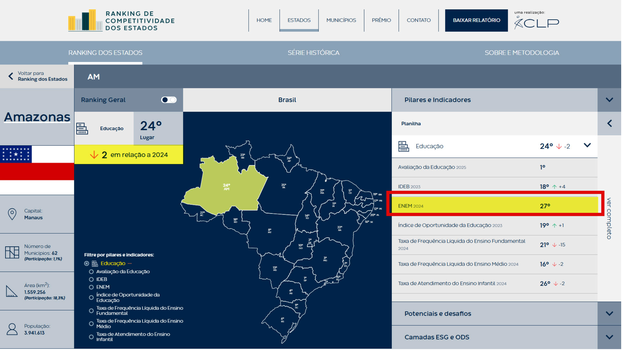 Um relatório do Centro de Liderança Publica mostra que o Amazonas está entre os últimos colocados no pilar Educação, um dos dez temas avaliados pelo CLP. O estado enfrenta baixa taxa de frequência escolar e alta distorção idade-série — quando o estudante está em uma série diferente da esperada para sua idade.