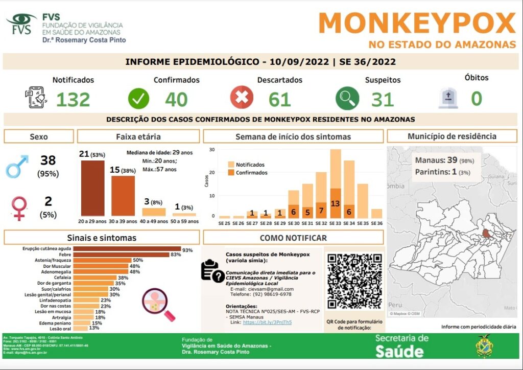 Amazonas – A Fundação de Vigilância Sanitária do Amazonas confirmou neste sábado (10) que mais 3 casos de varíola dos macacos no estado foram notificados, elevando o número de ocorrências confirmadas para 40.