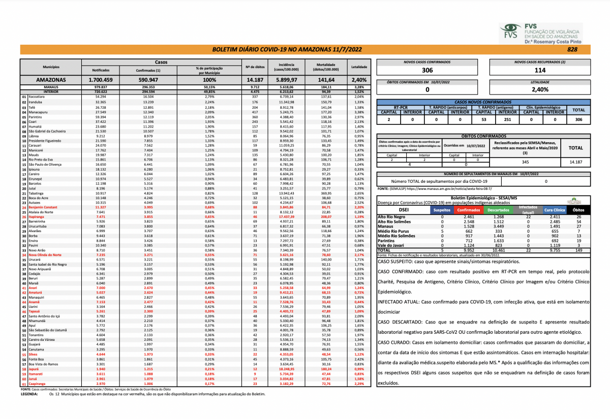 Confira o boletim divulgado pela Fundação de Vigilância em Saúde do Amazonas (FVS):
