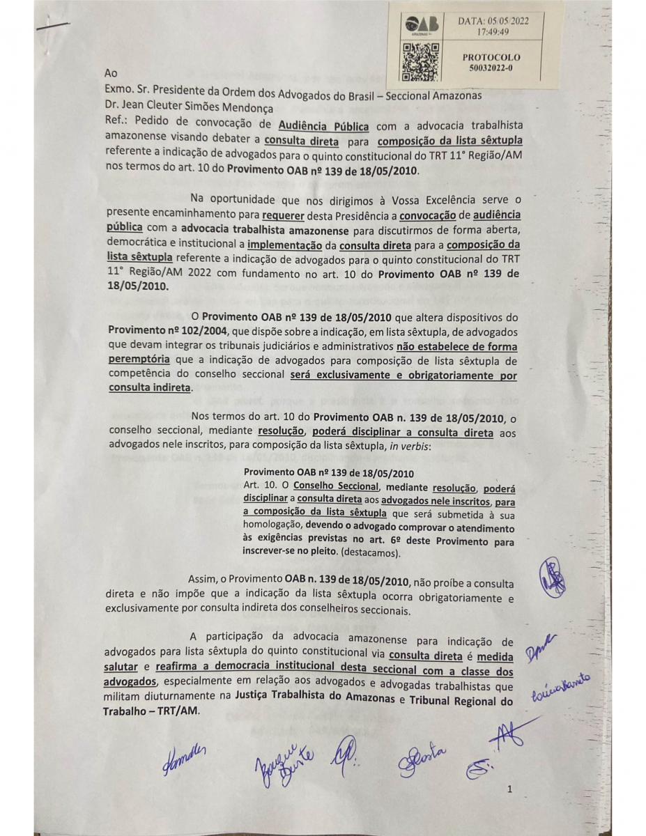 O requerimento, assinado pelos advogados Paulo Maffioletti, Lúcia Barreto, Aline da Costa, Cláudia Portella, Lucilene Macêdo, Esther de Sousa, Kennedy Paz Tiradentes, Marcelo Santos, Yury Croiff Thury, Izaque d Duarte, Sidney Coelho, Marcelo Pinheiro, Márcio Tavares, Raimundo de Amorim Soares e Raimundo de Amorim Soares Filho endereçado à Presidência da OAB/AM destaca que “A participação da advocacia amazonense para indicação de advogados para lista sêxtupla do quinto constitucional via consulta direta é medida salutar e reafirma a democracia institucional desta seccional com a classe dos advogados, especialmente em relação aos advogados e advogadas trabalhistas que militam diuturnamente na Justiça Trabalhista do Amazonas e Tribunal Regional do Trabalho – TRT/AM.” e que “A participação dos advogados trabalhistas na consulta direta para formação da lista sêxtupla demonstrará o compromisso institucional desta atual gestão que vem declarando no meio da classe dos advogados do Amazonas uma OAB UNIDA.”