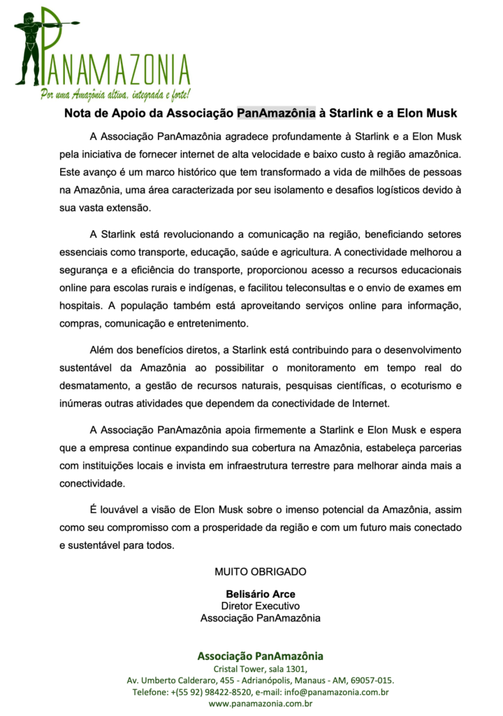 Na nota, a Associação reforça seu apoio firme à Starlink e a Elon Musk, expressando a esperança de que a empresa continue a expandir sua cobertura na Amazônia. A instituição encoraja a Starlink a estabelecer parcerias com organizações locais e a investir em infraestrutura terrestre para melhorar ainda mais a conectividade da região.