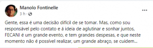 “Gente, essa é uma decisão difícil de se tomar. Mas, como sou responsável pelo contato e á ideia de aglutinar e sonhar juntos, FECANI é um grande evento, e tem grandes despesas, e que neste momento não é possível realizar, um grande abraço, se cuidem…”, informou Manolo através do Facebook.