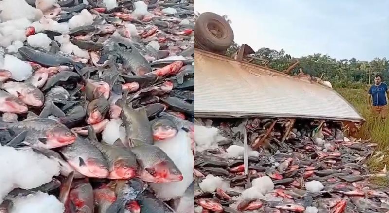 O acidente resultou na perda de grande parte da carga, com centenas de peixes espalhados pela pista de terra. Um vídeo que circula nas redes sociais registra a reação de populares no local, surpresos com a quantidade: “É muito peixe, né cara? Tá é doido o negócio, velho”, diz um dos homens, enquanto outro orienta: “Bora cobrir, bora cobrir de lona! Cadê a lona?”.