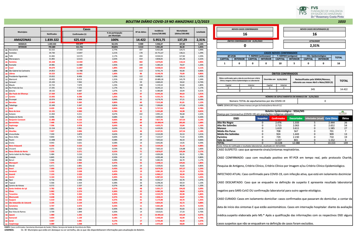 No dia 1º de fevereiro, o órgão informou em mais uma edição do Boletim Diário da Covid-19, apenas 16 novos casos da doença, o que totalizava o número de 625.418 casos registrados desde o início da pandemia.