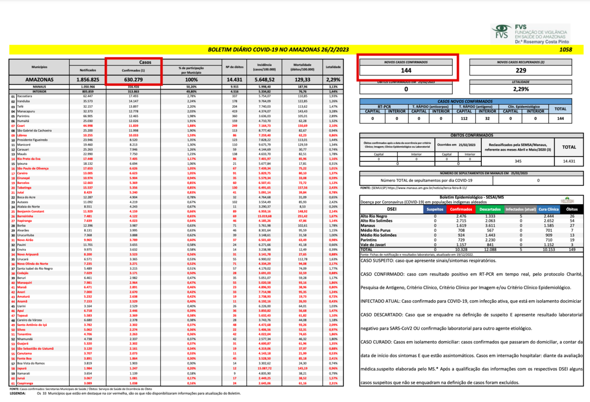 Amazonas – Estamos no penúltimo dia do mês de fevereiro e após todo o período carnavalesco que passamos, os números de casos da Covid-19 vêm aumentando em todo o estado do Amazonas. Somente nos 26 dias primeiros dias deste mês, foram registrados mais de 4 mil novos casos da doença. As informações são da Fundação de Vigilância em Saúde do Amazonas – Drª Rosemary Costa Pinto (FVS-RCP).