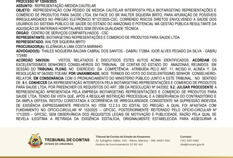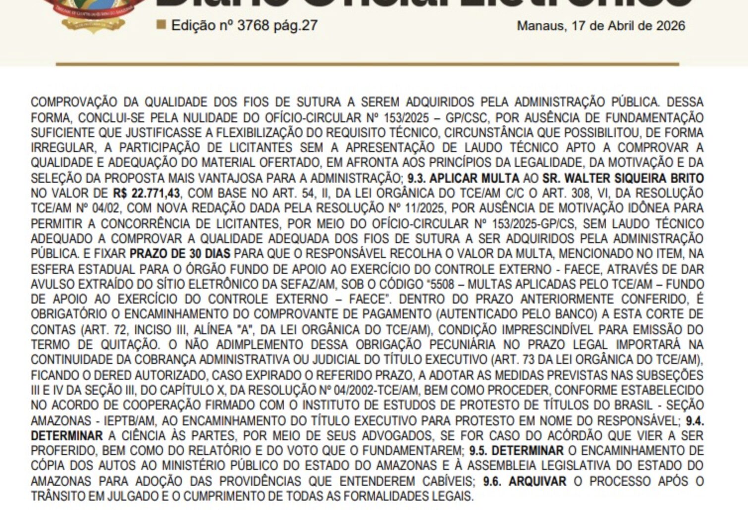Amazonas – O Tribunal de Contas do Estado do Amazonas (TCE-AM) identificou irregularidades em um processo licitatório conduzido pelo Centro de Serviços Compartilhados (CSC-AM), responsável pela aquisição de fios de sutura destinados à rede pública de saúde. A decisão resultou na aplicação de multa ao presidente do órgão, Walter Siqueira Brito, e no encaminhamento do caso para outros órgãos de controle.