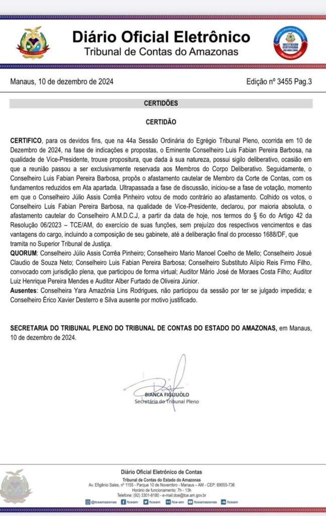 Amazonas – Em uma sessão extraordinária que tomou rumos inesperados no Tribunal de Contas do Estado do Amazonas (TCE-AM), o conselheiro Ari Moutinho Júnior foi afastado de suas funções por decisão da maioria dos conselheiros.