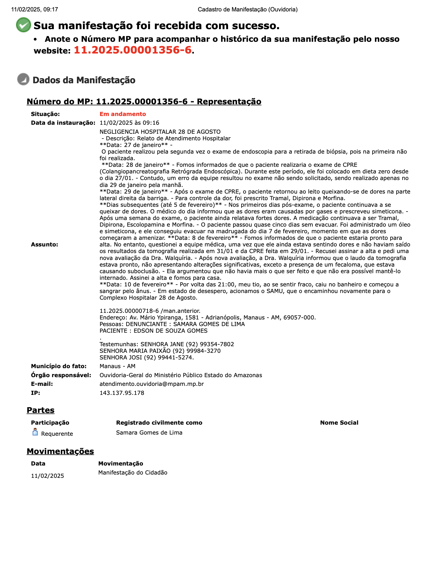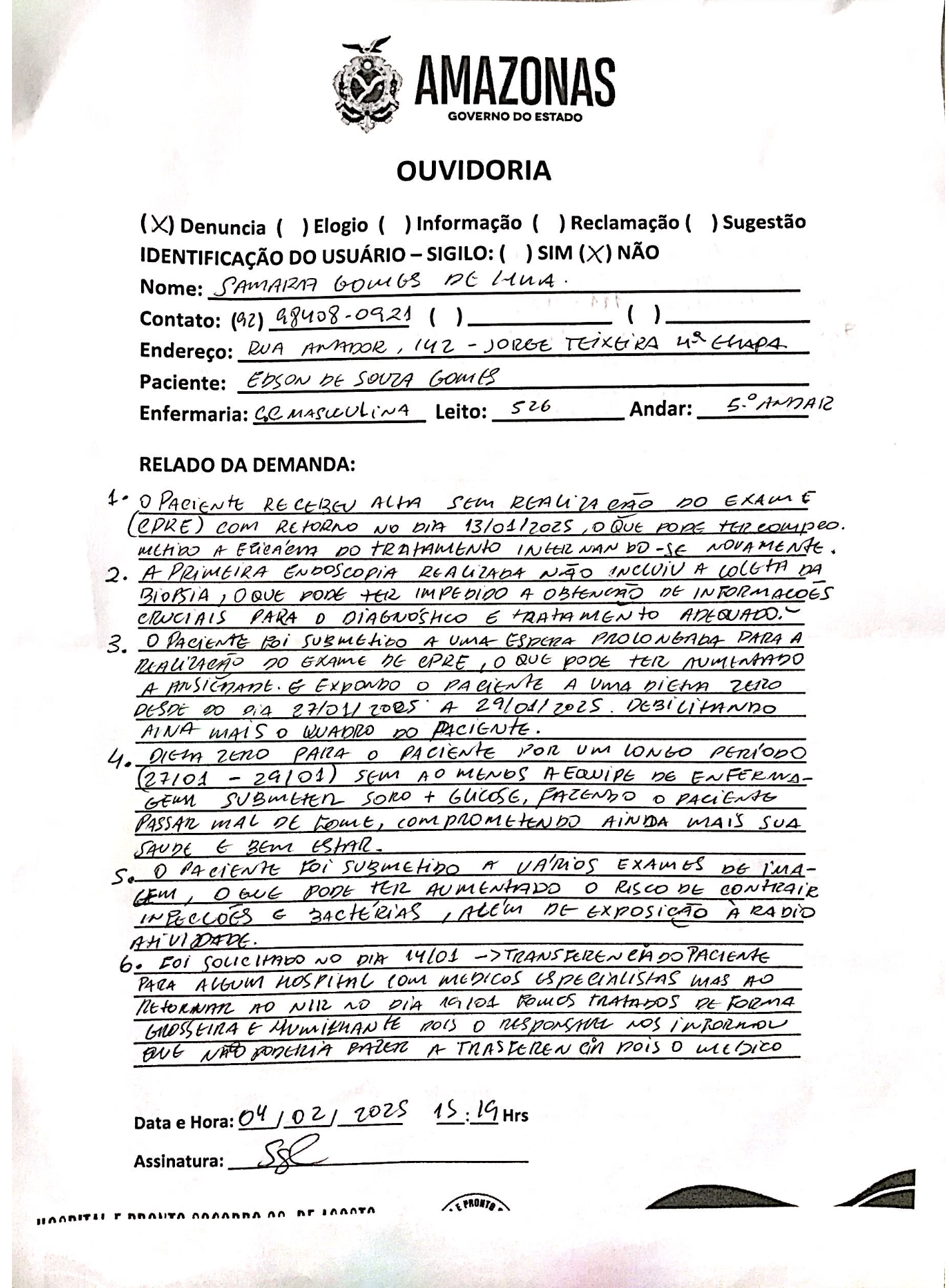 O sistema de saúde público do Amazonas segue em colapso, com mais um caso exposto pela denúncia da família de Édson de Souza Gama. Pacientes e familiares esperam, diariamente, por uma resposta das autoridades, mas o que se vê é uma sucessão de promessas não cumpridas e um sistema que não parece pronto para atender a população com a seriedade e respeito que ela merece.