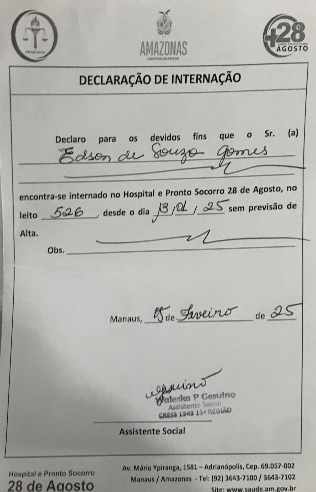 Manaus – A saúde pública no Amazonas continua a atravessar uma crise alarmante, com relatos cada vez mais frequentes de negligência e falta de atenção às necessidades da população. Um caso recente, que vem ganhando atenção e gerando indignação, é o de Édson de Souza Gama, de 58 anos, que foi internado no Hospital e Pronto-Socorro 28 de Agosto, em Manaus, e cujos familiares denunciam um atendimento falho e desumano.