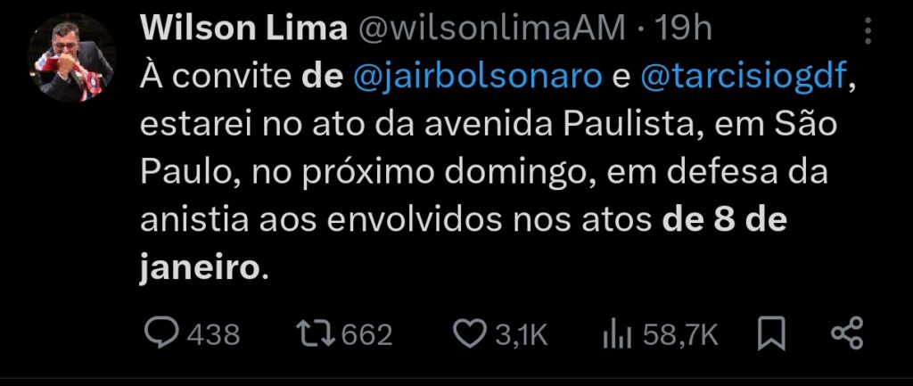 Amazonas – O governador do Amazonas, Wilson Lima (União Brasil), confirmou sua participação em um ato programado para este domingo, 6 de abril de 2025, em São Paulo, que defende a anistia dos presos envolvidos nos atos antidemocráticos de 8 de janeiro de 2023, em Brasília. O evento, que contará com a presença do ex-presidente Jair Bolsonaro (PL), tem gerado debates devido ao histórico do governador, que já se posicionou publicamente contra os episódios que marcaram aquela data.