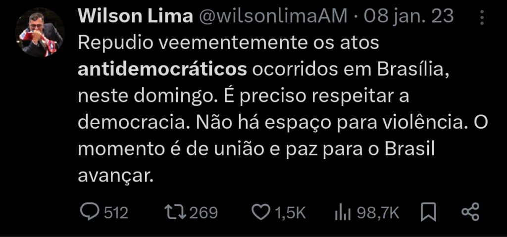 Em janeiro de 2023, quando manifestantes invadiram e vandalizaram as sedes do Supremo Tribunal Federal (STF), do Palácio do Planalto e do Congresso Nacional, Wilson Lima foi enfático em suas redes sociais ao repudiar os atos. Na ocasião, o governador expressou rejeição às ações que ameaçaram a ordem democrática, alinhando-se a uma postura de defesa das instituições. Esse posicionamento claro contrasta com sua decisão de agora apoiar uma manifestação que busca a liberação daqueles que foram responsabilizados pelos eventos.