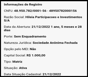 Apesar do capital social declarado de apenas mil reais, a Hileia Participações e Investimentos S/A conseguiu adquirir um terreno avaliado em R$5,5 milhões. Segundo documentos obtidos pelo Portal CM7 Brasil, Braguinha teria recebido inicialmente R$300 mil das mãos de Lucas Richel. Após a denúncia ser divulgada, Braguinha, sabendo que seria exonerado, agilizou o processo de titulação, concluindo-o em apenas 48 horas – um prazo surreal, considerando que o cidadão comum espera até cinco anos.