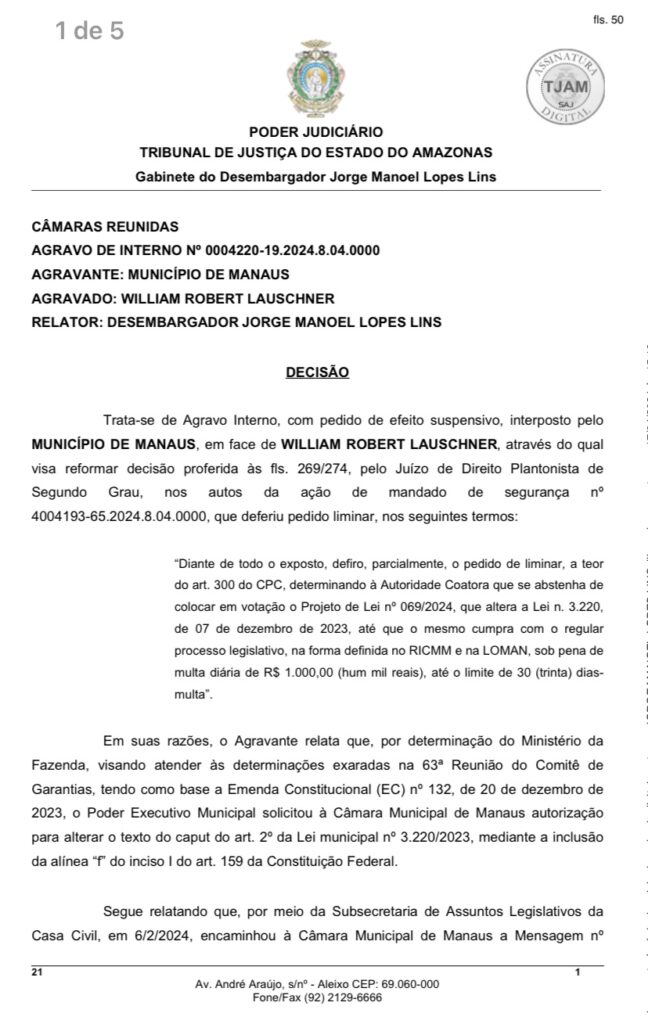 Amazonas – Uma decisão judicial surpreendente agitou os bastidores políticos de Manaus nesta quarta-feira (17). O desembargador Jorge Lins derrubou uma decisão anterior do juiz Lafayette que havia vetado o empréstimo da prefeitura. A ação que resultou na revogação do veto foi movida pelo vereador William Alemão, do partido de Amom Mandel, o Cidadania.