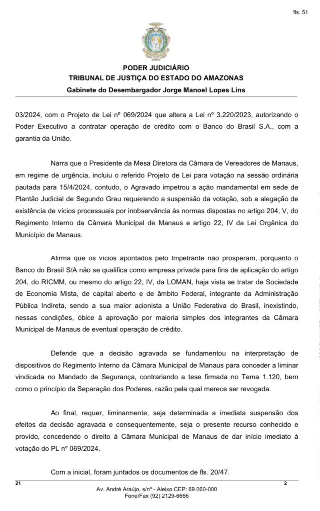 O conflito jurídico teve início quando o Poder Executivo Municipal solicitou à Câmara Municipal de Manaus autorização para alterar a Lei municipal no 3.220/2023, visando contratar uma operação de crédito com o Banco do Brasil S.A., com garantia da União. O presidente da Mesa Diretora da Câmara incluiu o projeto de lei para votação em regime de urgência, marcada para 15/4/2024. No entanto, o vereador William Alemão impetrou uma ação mandamental em Plantão Judicial de Segundo Grau para suspender a votação, alegando vícios processuais.