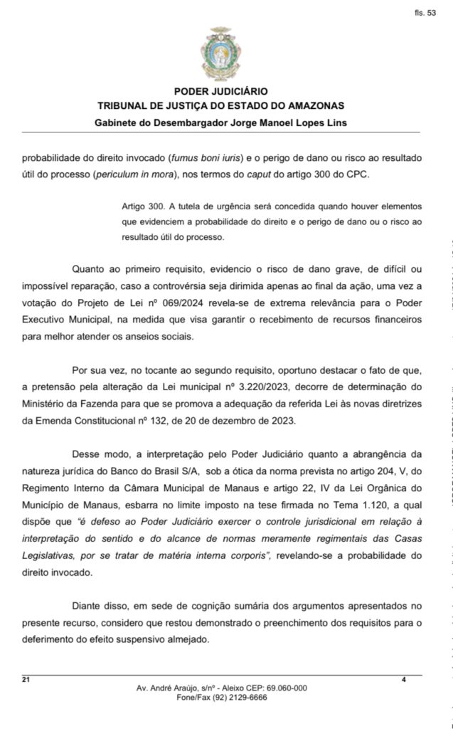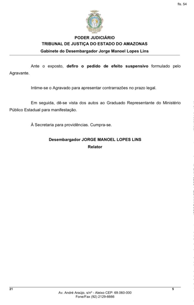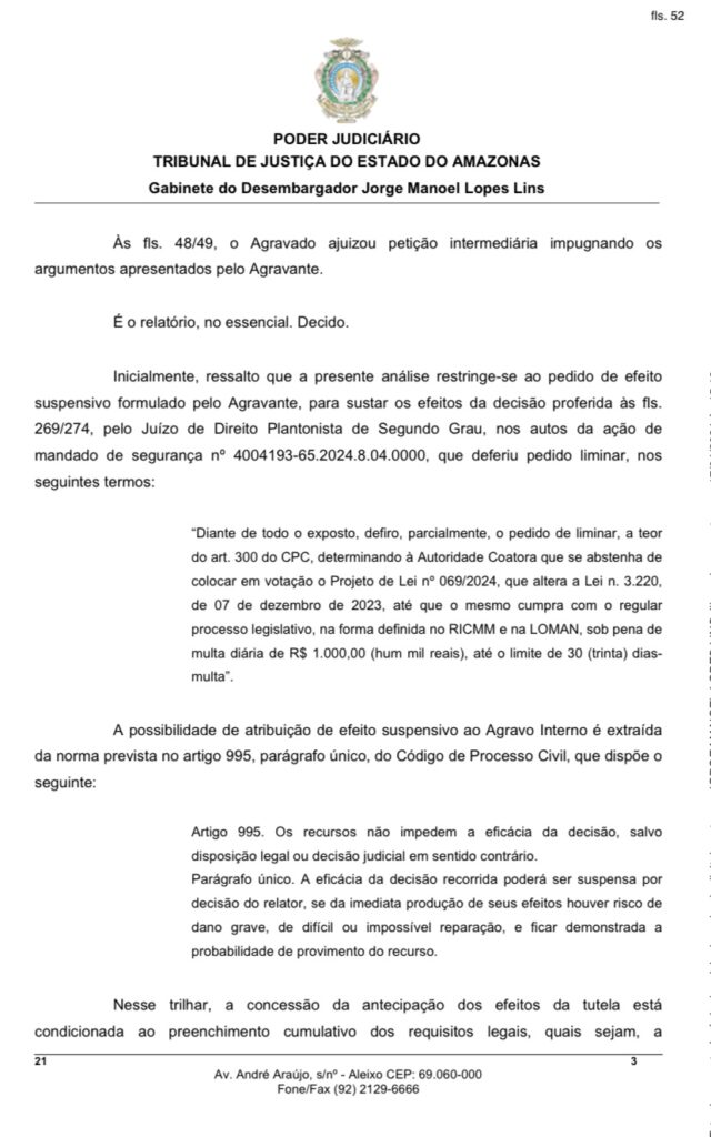 Com isso, o desembargador concedeu o efeito suspensivo ao recurso do Município de Manaus, autorizando a continuidade do processo de votação do Projeto de Lei no 069/2024, que agora poderá seguir os trâmites legislativos regulares.