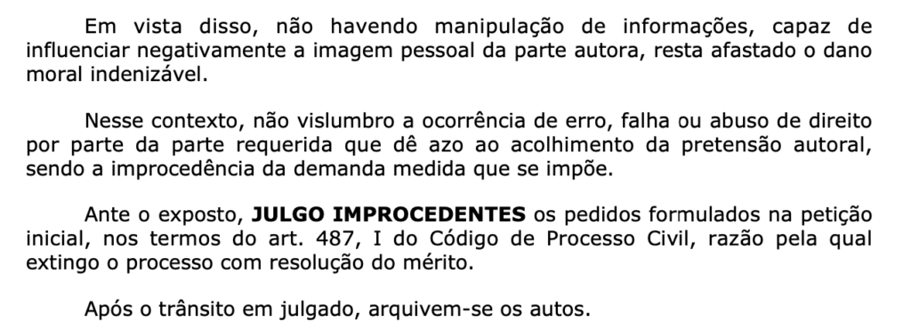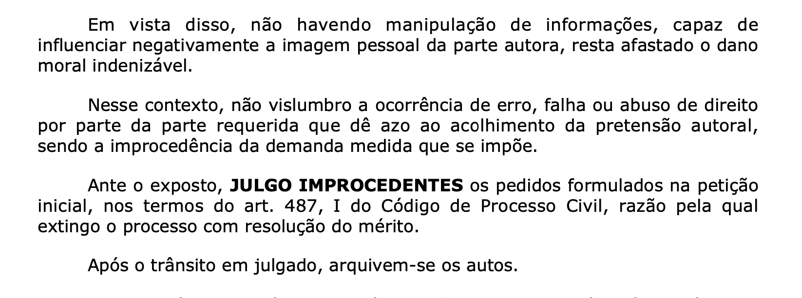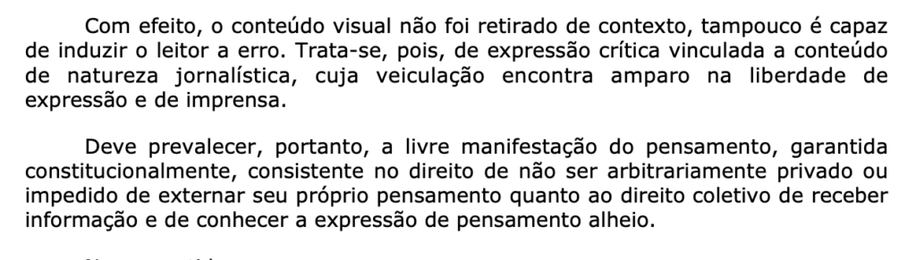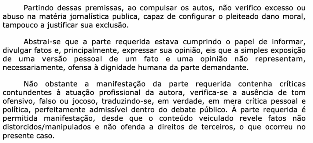 Paula Litaiff alegou que a matéria do CM7 Brasil tinha um tom sensacionalista e associava sua imagem à disseminação de notícias falsas, tentando prejudicar sua reputação profissional. Mas o juiz discordou, afirmando que o conteúdo estava protegido pelo direito constitucional à liberdade de expressão. A matéria foi considerada uma crítica legítima, sem ofensas ou mentiras, e a imagem da autora com um selo de “fake news” foi vista como parte do contexto jornalístico, sem qualquer abuso.