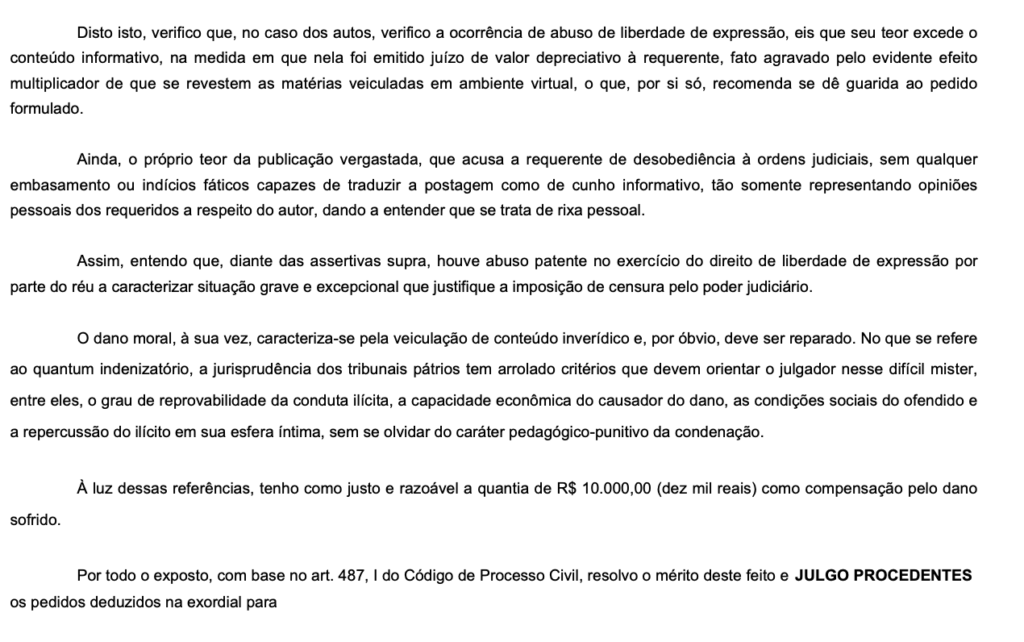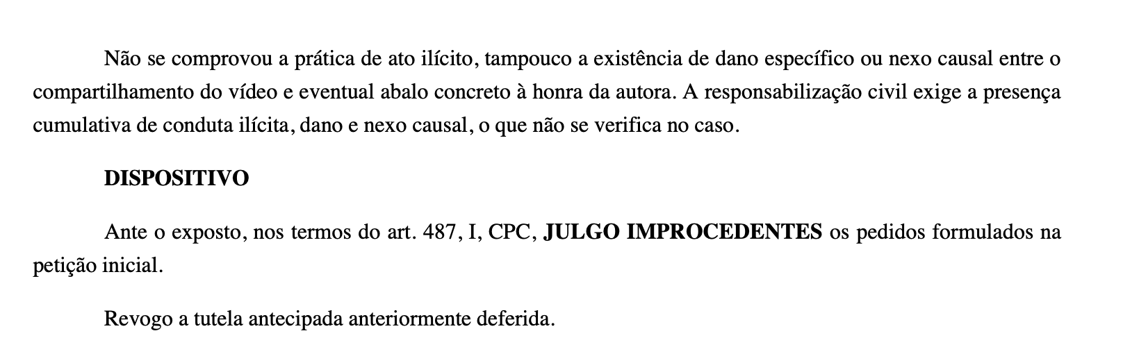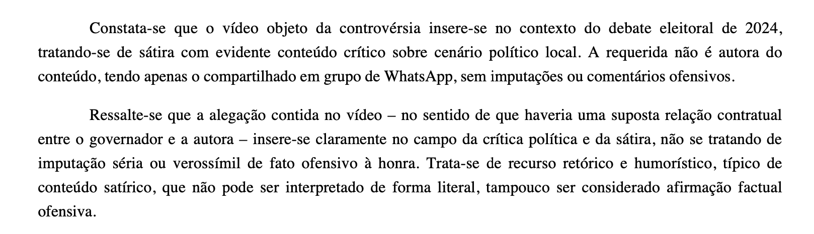 Já no processo 0103004-38.2024.8.04.1000, o juiz Ian Andrezzo Dutra também negou o pedido de indenização movido pela dona do blog Revista Cenarium. A ação envolvia um vídeo de sátira política, mas a Justiça entendeu que o conteúdo se tratava de crítica legítima, comum em debates eleitorais, e que figuras públicas, como Paula Litaiff, estão sujeitas a maior tolerância a críticas.