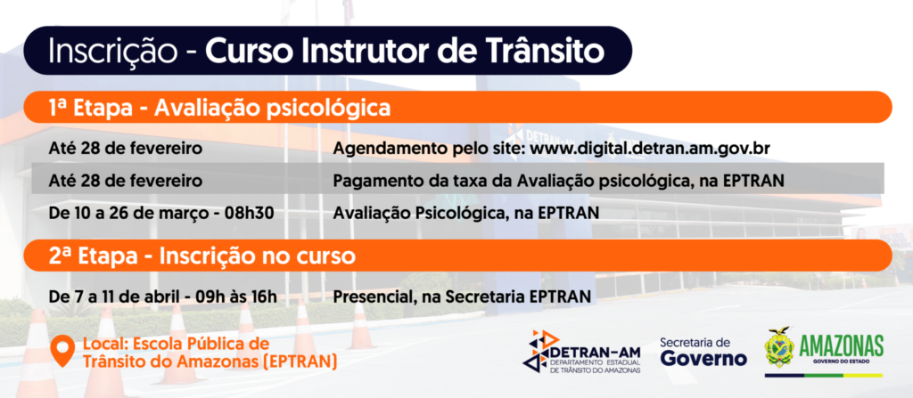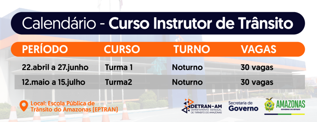 Amazonas – O Departamento Estadual de Trânsito do Amazonas (Detran-AM), por meio da Escola Pública de Trânsito (Eptran), está com matrículas gratuitas abertas para o curso de formação de instrutor de trânsito. As aulas serão ministradas em Manaus, com a finalidade de capacitar profissionais para atuarem no processo de formação de condutores de veículos automotores e elétricos. Serão oferecidas 60 vagas e para participar da seleção, é preciso ser aprovado em um exame psicológico, que deve ser agendado mediante o pagamento de uma taxa.