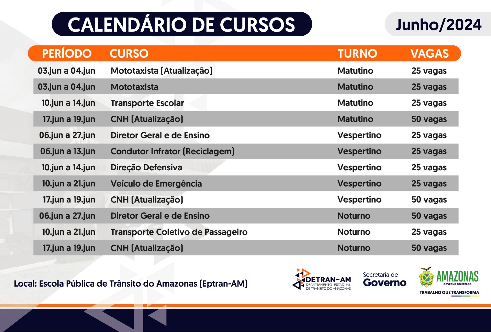 Amazonas – A Escola Pública de Trânsito (Eptran), por meio do Departamento Estadual de Trânsito do Amazonas (Detran-AM), está com inscrições abertas para nove cursos que serão realizados ao longo do mês de junho de 2024. Entre as ofertas estão: Formação e Atualização para Motoxistas, Condutor de Transporte Escolar e Veículo de Emergência, Condutor de Transporte de Coletivo de Passageiro, Diretor Geral e de Ensino, Direção Defensiva, Reciclagem de Condutor Infrator e Atualização de CNH.