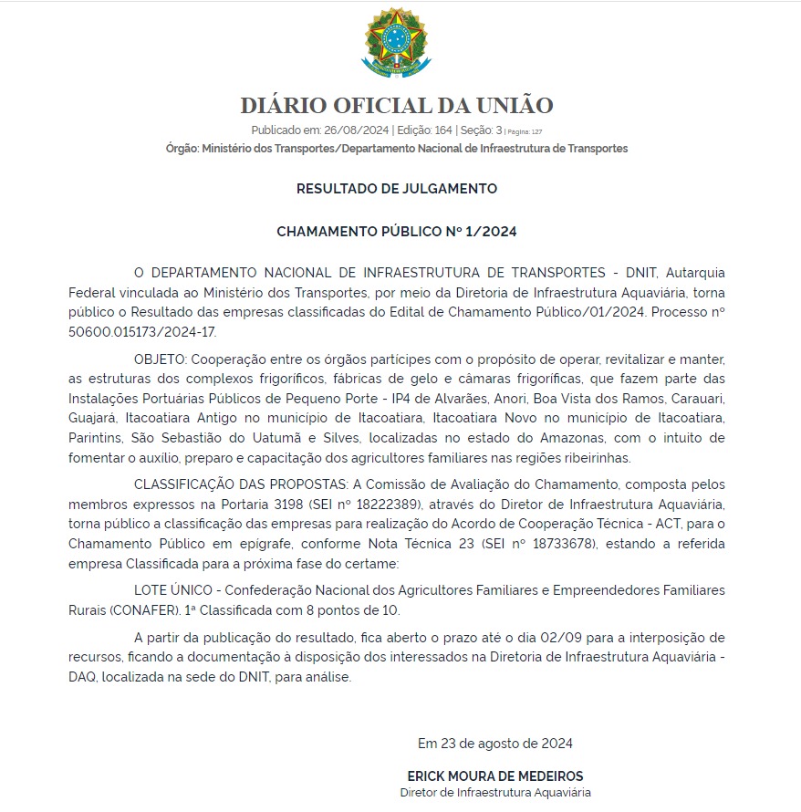 Amazonas – O Departamento Nacional de Infraestrutura de Transportes (DNIT) anunciou, por meio do Diário Oficial da União (DOU), as empresas classificadas para operar, revitalizar e manter as estruturas dos complexos frigoríficos, fábricas de gelo e câmaras frigoríficas nas Instalações Portuárias Públicos de Pequeno Porte (IP4) em diversas cidades do Amazonas. O objetivo do projeto é proporcionar apoio aos agricultores familiares das regiões ribeirinhas, promovendo o preparo e a capacitação necessários para melhorar a produção e a distribuição dos produtos.