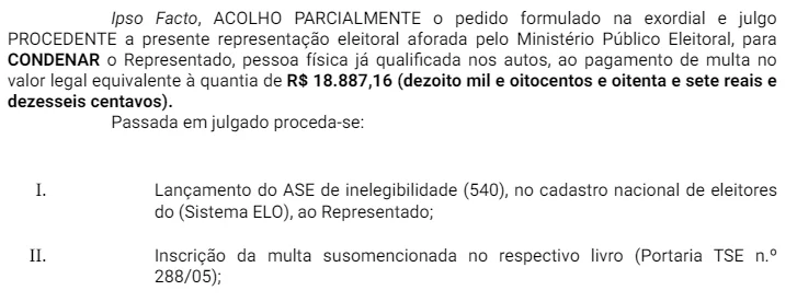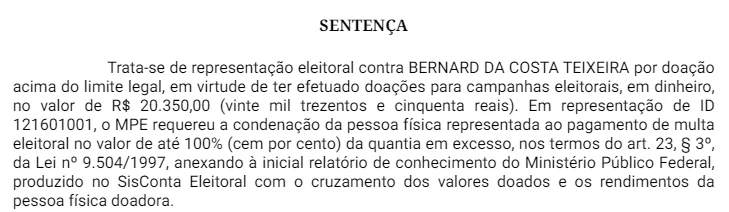 “Trata-se de representação eleitoral contra Bernard da Costa Teixeira por doação acima do limite legal, em virtude de ter efetuado doações para campanhas eleitorais, em dinheiro, no valor de R$ 20.350,00 (vinte mil trezentos e cinquenta reais). Em representação de ID 121601001, o MPE requereu a condenação da pessoa física representada ao pagamento de multa eleitoral no valor de até 100% (cem por cento) da quantia em excesso, nos termos do art. 23, § 3º, da Lei nº 9.504/1997, anexando à inicial relatório de conhecimento do Ministério Público Federal, produzido no SisConta Eleitoral com o cruzamento dos valores doados e os rendimentos da pessoa física doadora”, diz o juiz na sentença.