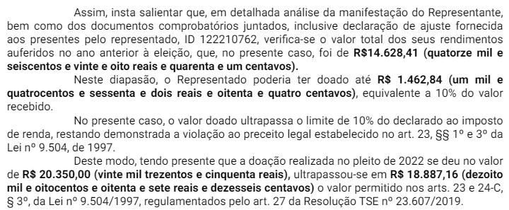 “Verifica-se o valor total dos seus rendimentos auferidos no ano anterior à eleição, que, no presente caso, foi de R$ 14.628,41 (quatorze mil e seiscentos e vinte e oito reais e quarenta e um centavos). Neste diapasão, o Representado poderia ter doado até R$ 1.462,84 (um mil e quatrocentos e sessenta e dois reais e oitenta e quatro centavos), equivalente a 10% do valor recebido. No presente caso, o valor doado ultrapassa o limite de 10% do declarado ao imposto de renda, restando demonstrada a violação ao preceito legal estabelecido no art. 23, §§ 1º e 3º da Lei nº 9.504, de 1997”, completou o juiz.