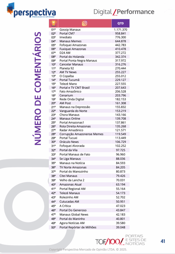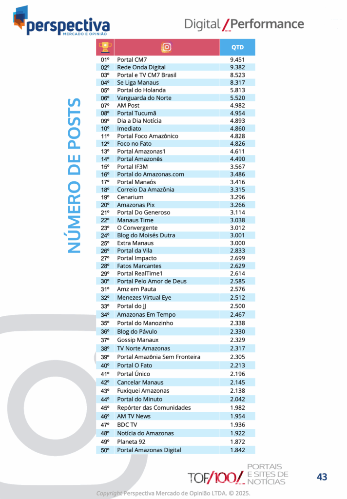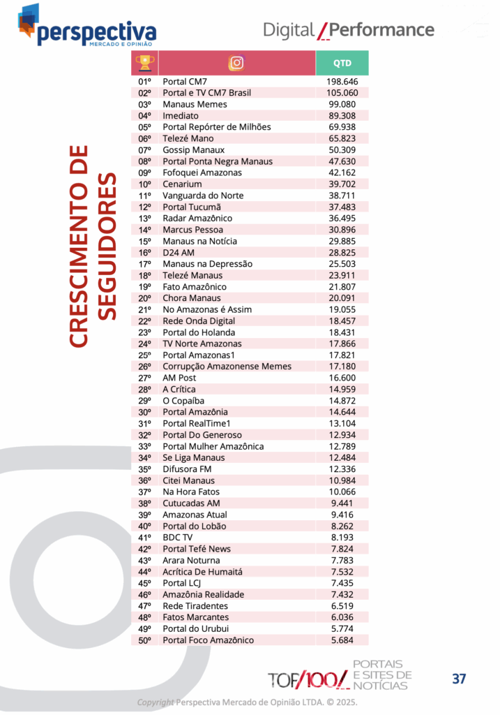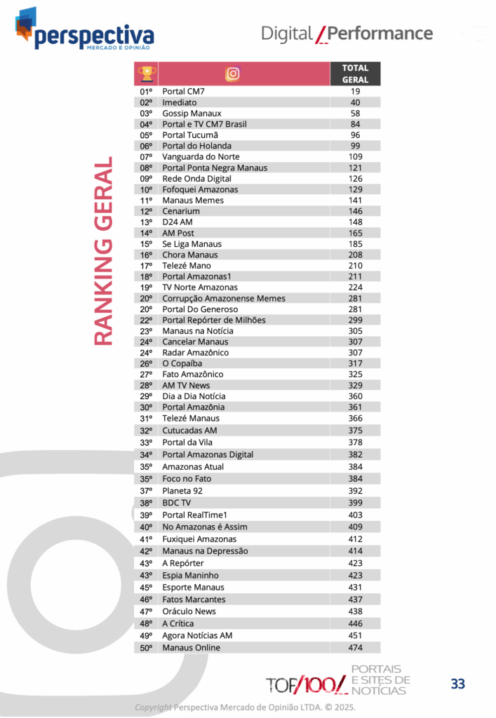 O estudo mostra que o CM7 Brasil se destacou em diversas métricas importantes, consolidando sua posição de destaque no estado. A pesquisa colocou o portal em primeiro lugar no ranking geral do Instagram, demonstrando a força e o alcance de sua presença digital.