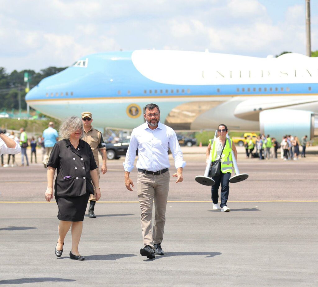Joe Biden desembarcou em Manaus por volta das 12h30, no Aeroporto Internacional Eduardo Gomes, zona oeste, após cumprir agenda no Peru. Acompanhado da embaixadora dos Estados Unidos no Brasil, Elisabeth Frawley Bagley, o governador Wilson Lima cumprimentou o presidente norte-americano e agradeceu pela visita ao Amazonas, reforçando as relações diplomáticas entre os países.