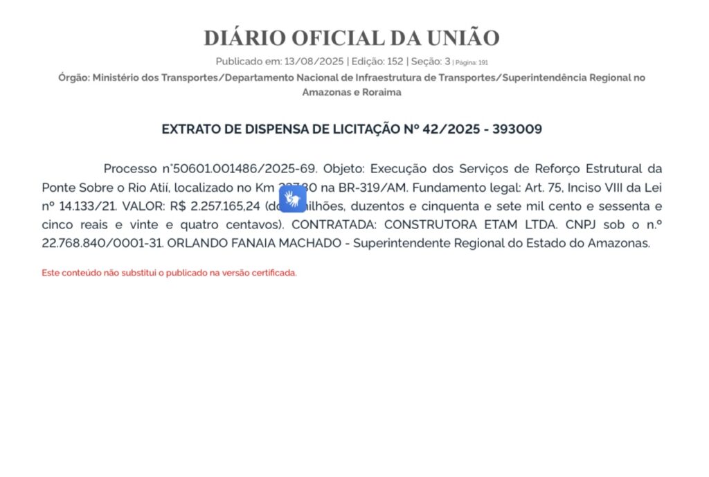 Amazonas – O Departamento Nacional de Infraestrutura de Transportes (DNIT) voltou a contratar, por dispensa de licitação, a Construtora Etam LTDA, empresa investigada pela Polícia Federal e com ligação familiar ao governador do Acre, Gladson Cameli (PP). O extrato do contrato foi publicado no Diário Oficial da União (DOU) e prevê reforço estrutural na BR-319, no quilômetro 23,10, em Careiro da Várzea (AM), com valor de R$ 2,25 milhões.