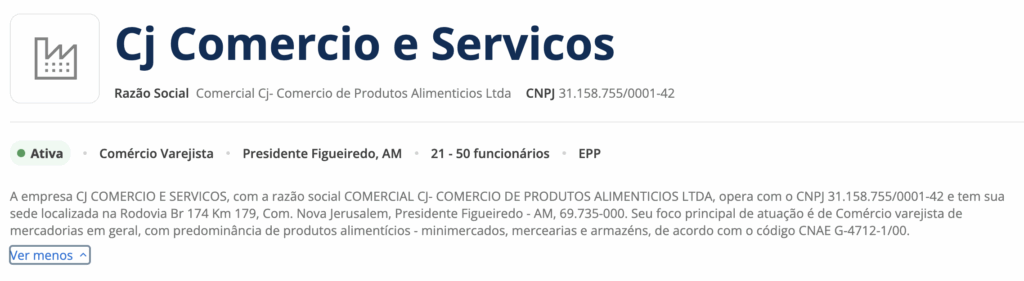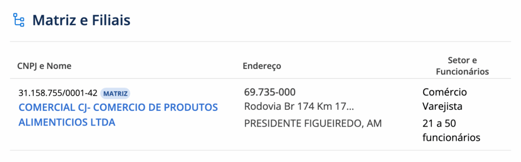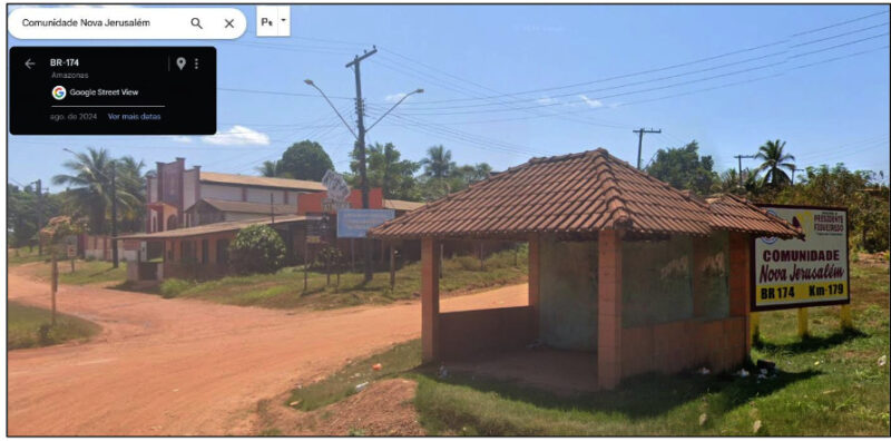 Além disso, o endereço oficial informado — BR-174, Km 179, comunidade Nova Jerusalém, em Presidente Figueiredo (AM) —, ao ser verificado por imagens recentes do Google Maps (atualizadas em agosto de 2024), corresponde apenas a uma parada de ônibus à beira da rodovia, sem qualquer estrutura empresarial visível no local.