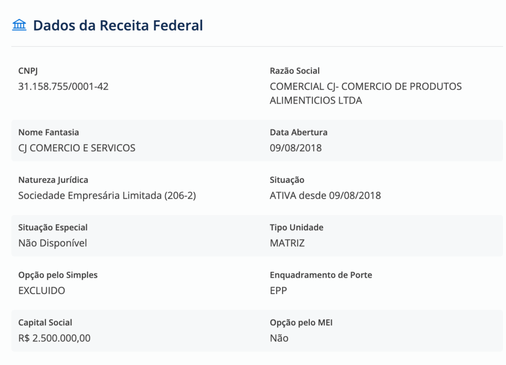 Fundada em 2018, a CJ Comércios e Serviços possui capital social declarado de R$ 2,5 milhões e atua em setores que vão do comércio varejista de alimentos à manutenção de embarcações, construção civil, arquitetura, serviços funerários, turismo, veterinária e confecção de roupas, entre outros.