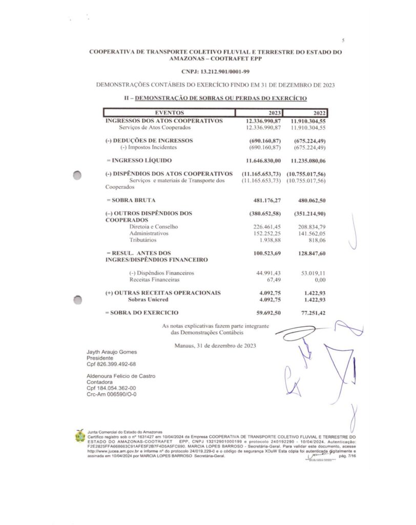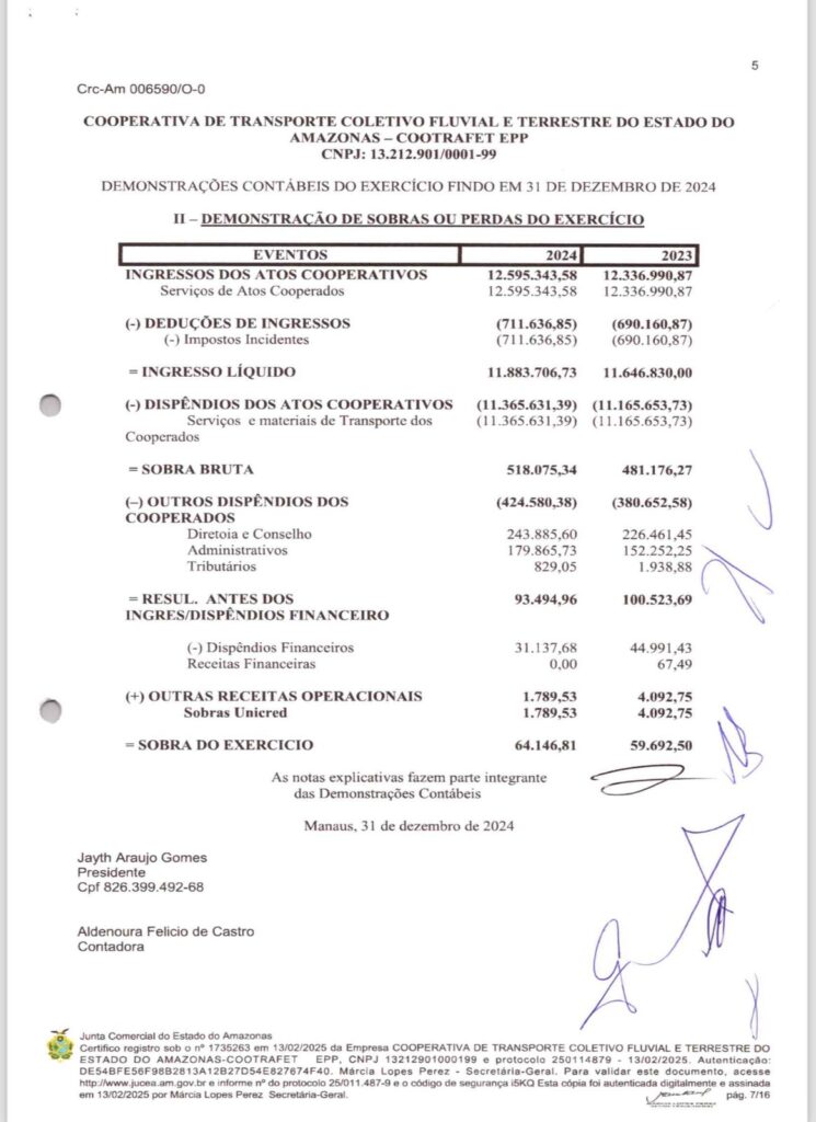 Ao longo dos anos, a relação da COOTRAFET com a Prefeitura de Manacapuru gerou um impacto financeiro significativo. Segundo as demonstrações contábeis da cooperativa, os valores recebidos por serviços prestados ao município entre 2022 e 2024 somam mais de R$ 36 milhões brutos, antes das deduções de impostos. Confira o detalhamento: