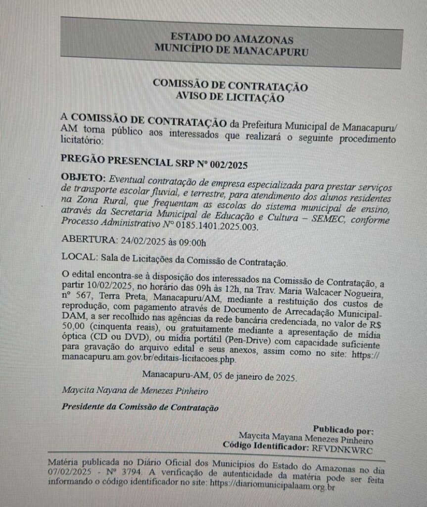 Amazonas – A Cooperativa de Transporte Coletivo Fluvial e Terrestre do Estado do Amazonas (COOTRAFET), sediada em uma casa de esquina na Rua Fausto Ventura, 355, Centro de Manacapuru, está novamente no centro de uma controvérsia que levanta sérias dúvidas sobre a lisura de processos licitatórios no município. Em 24 de fevereiro de 2025, a entidade participou do Pregão Presencial SRP nº 002/2025, promovido pela Prefeitura de Manacapuru, cujo objeto é a contratação de serviços de transporte escolar fluvial e terrestre para atender alunos da zona rural. A disputa, conduzida pela Comissão de Contratação sob a presidência de Maycita Nayana de Menezes Pinheiro, reacende denúncias de favorecimento e manipulação, ecoando um histórico de irregularidades já apontadas pelo Tribunal de Contas do Estado do Amazonas (TCE-AM).