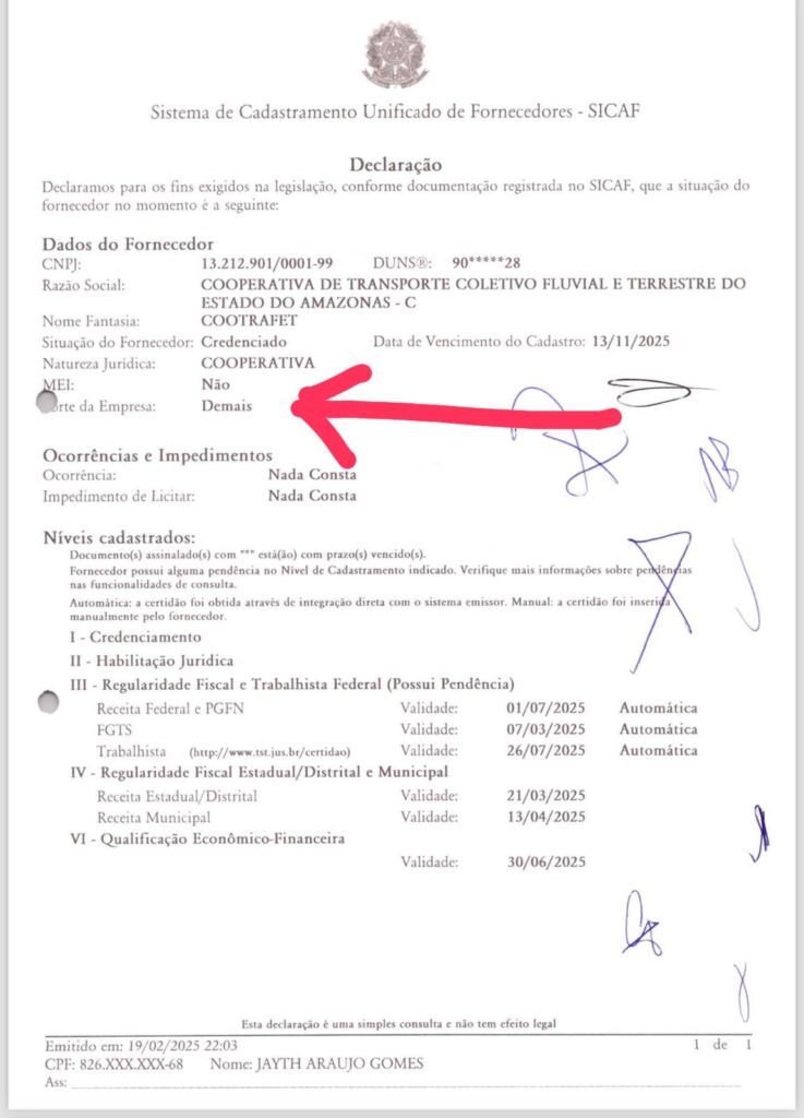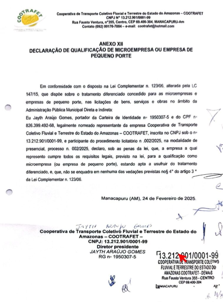 A COOTRAFET apresentou no certame uma declaração assinada por seu presidente, Jayth Araújo Gomes, afirmando ser uma empresa de pequeno porte (EPP), o que lhe garantiria vantagens previstas na Lei Complementar nº 123/06. Contudo, documentos contábeis da própria cooperativa, relativos aos exercícios de 2022, 2023 e 2024, revelam um faturamento que ultrapassa os limites legais para essa classificação. Apenas entre 2022 e 2024, a cooperativa registrou ingressos líquidos de mais de R$ 34,7 milhões, um valor incompatível com o teto de R$ 4,8 milhões anuais estipulado para empresas de pequeno porte. A suspeita de falsidade documental coloca em xeque a legitimidade da participação da COOTRAFET no pregão e reacende o debate sobre a transparência na gestão pública de Manacapuru.