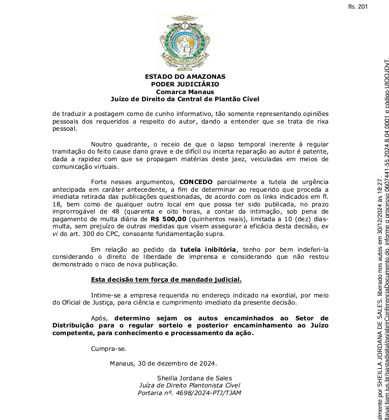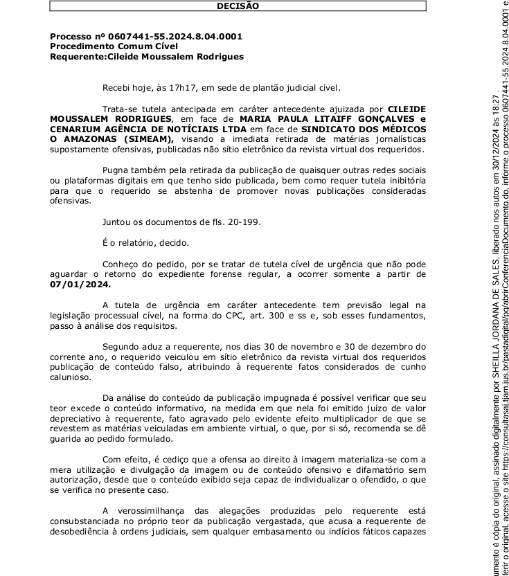 Manaus – A Justiça determinou, em caráter liminar, que o site Cenarium retire do ar uma série de publicações consideradas “inverídicas e de cunho depreciativo” contra a empresária Cileide Moussallem Rodrigues. A decisão também prevê multa diária de R$ 500, limitada a dez dias, caso as publicações não sejam removidas no prazo de 48 horas.