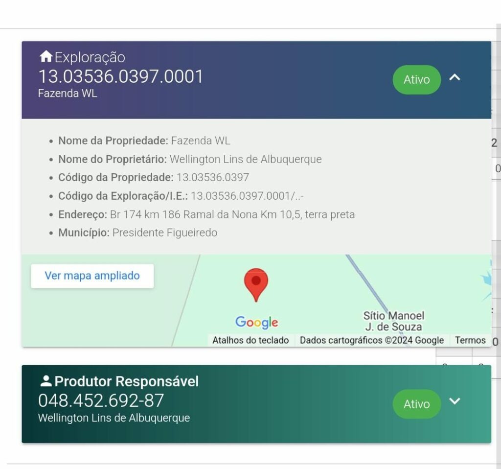 Segundo cadastro da Agência de Defesa Agropecuária e Florestal do Governo do Amazonas, a Adaf, a fazenda está registrada em nome do marido de Maria do Carmo, Wellington Lins de Albuquerque. Em pesquisa junto ao Instituto de Proteção Ambiental do Estado, o Ipaam, não há registro de licença ambiental expedida em favor de Wellington Lins.