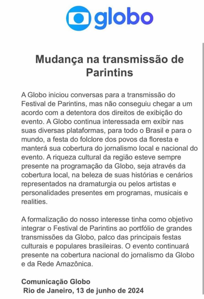 Em nota enviada ao F5 na tarde desta quinta-feira (13), a Globo explicou: “A Globo iniciou conversas para a transmissão do Festival de Parintins, mas não conseguiu chegar a um acordo com a detentora dos direitos de exibição do evento.”